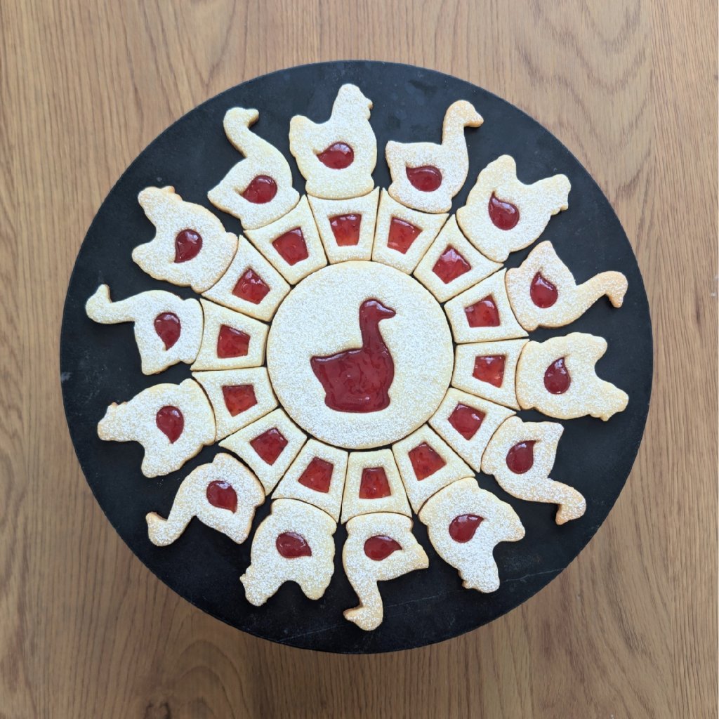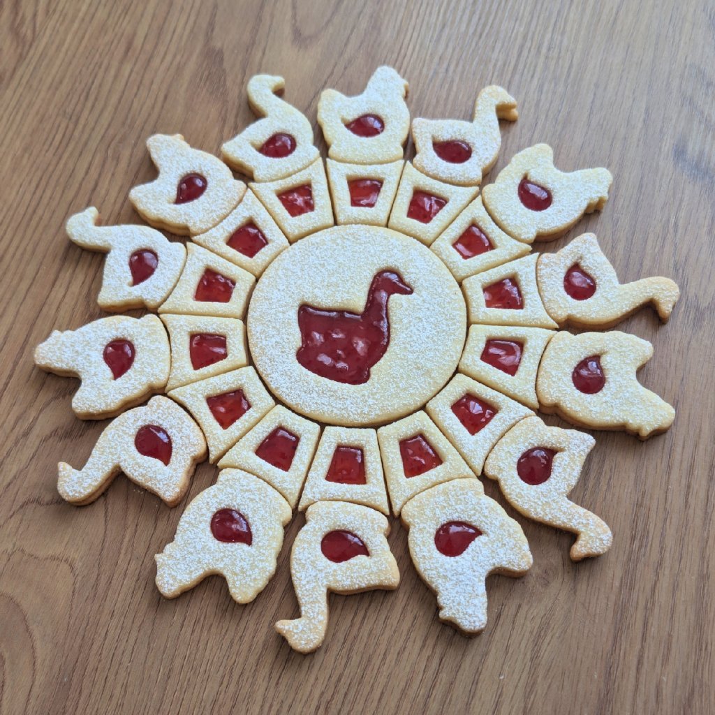 Tento linecký talíř má po zkompletování průměr cca 25 cm a je složen z celkem 29 kusů cukroví do designového tvaru.