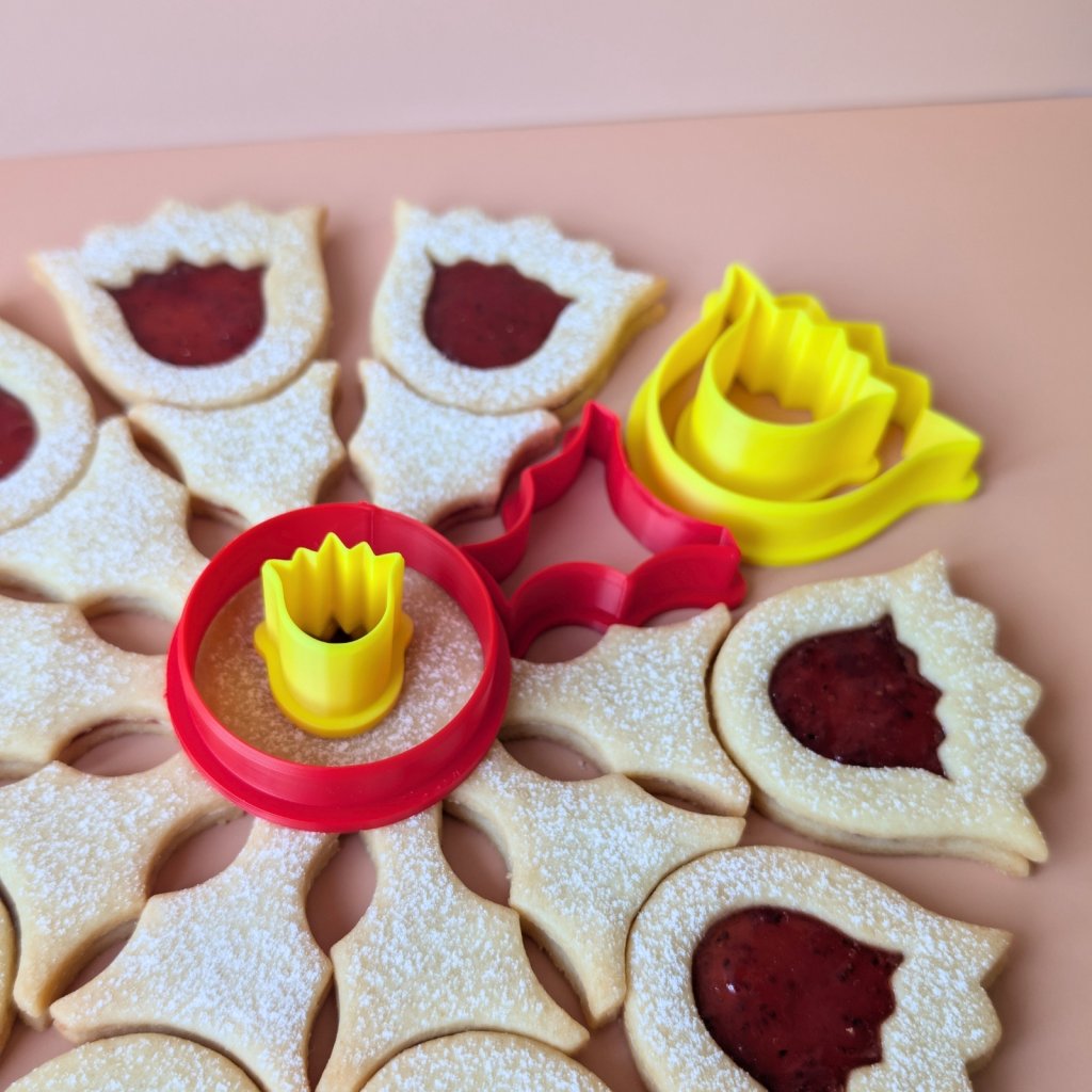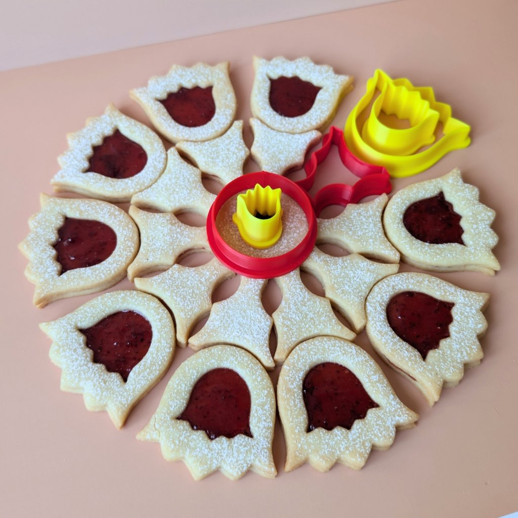 Sada je chytře vymyšlená a práce s ní je překvapivě snadná. Z klasického lineckého těsta si vykrojíte jeden středový kroužek a deset okvětních lístků pro spodní plnou část, a to samé pro vrchní část. Malým vykrajovátkem pak do vrchních dílů uděláte roztomilá okénka ve tvaru tulipánů. Po upečení vše slepíte oblíbenou červenou marmeládou a na podnosu seskládáte k sobě.