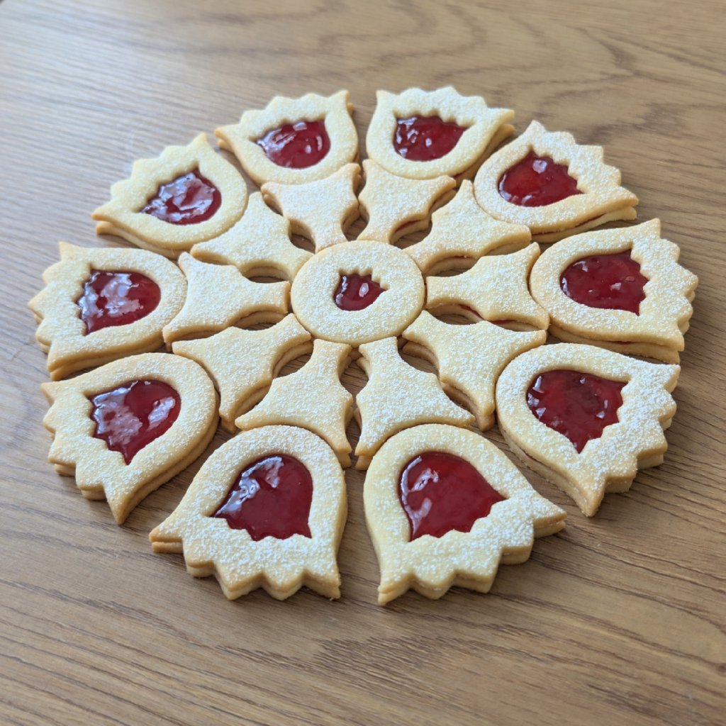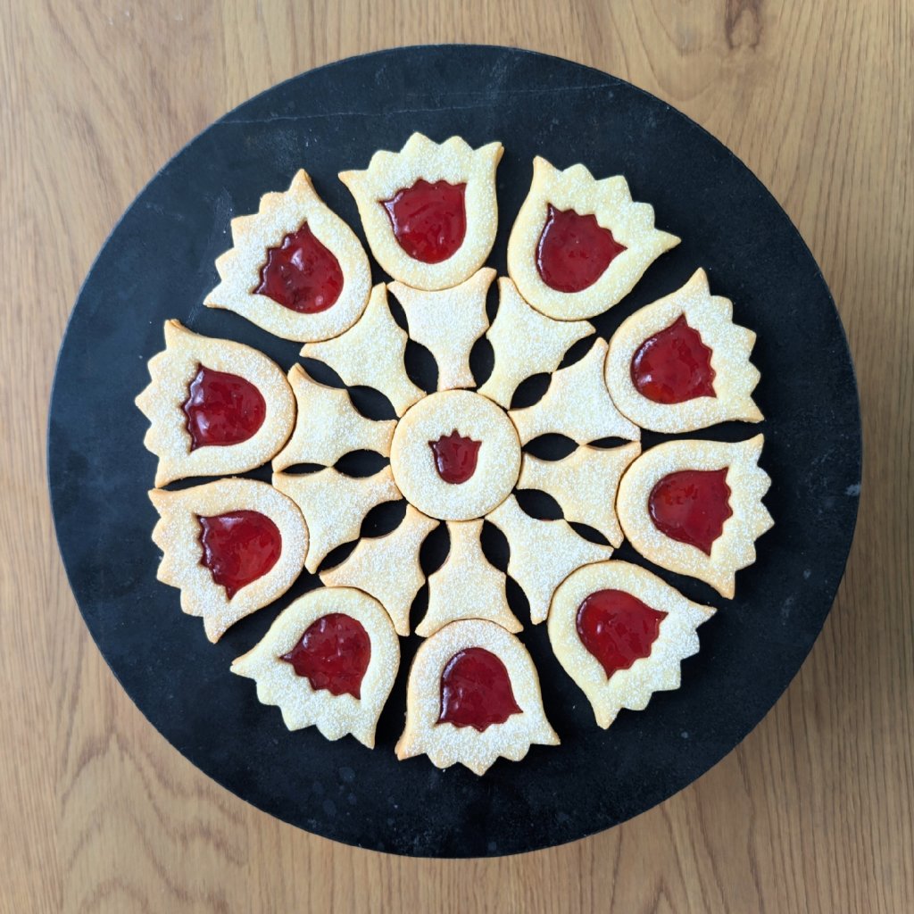 Tento linecký talíř má po zkompletování průměr cca 23 cm a je složen z celkem 21 kusů cukroví do designového tvaru.
