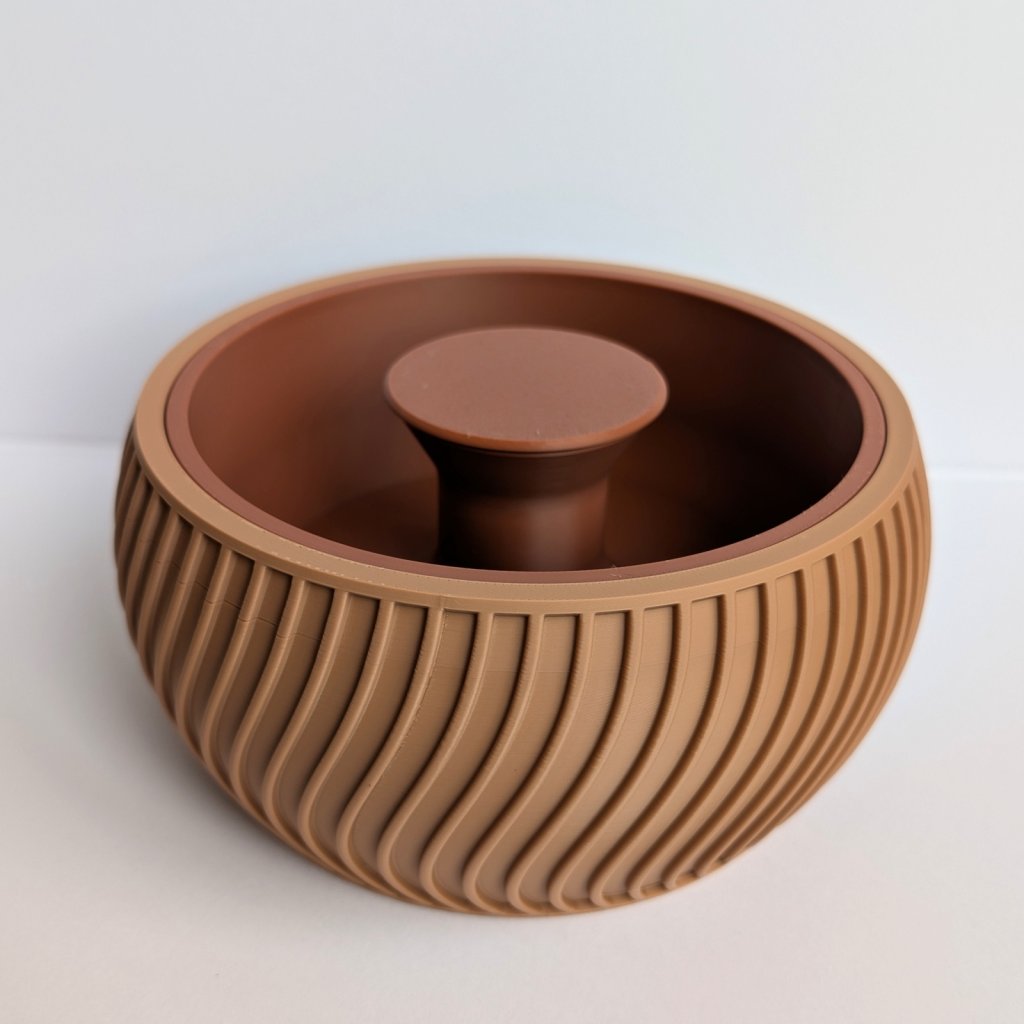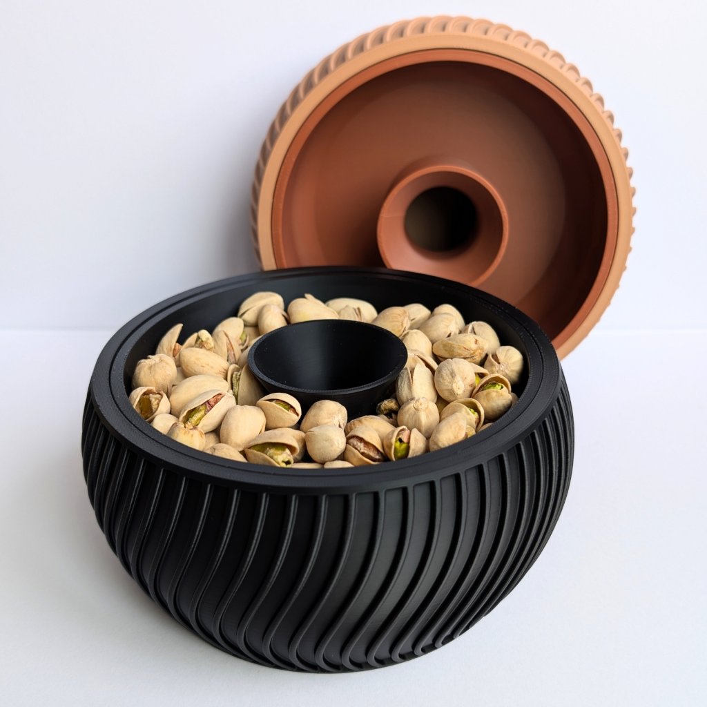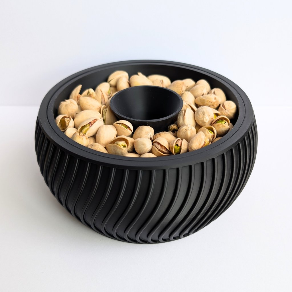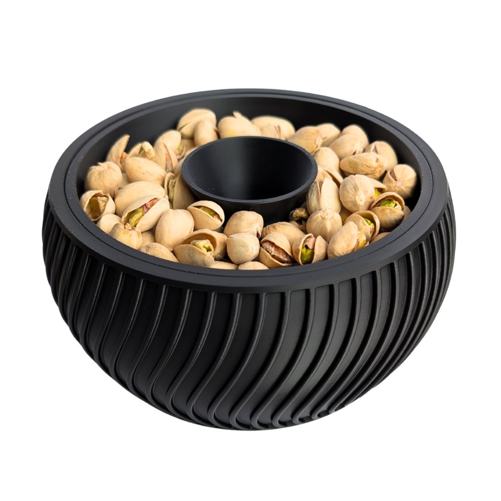 Díky tomuto řešení zůstává odpad skrytý zraku a váš stůl zůstane čistý po celou dobu mlsání. Miska je vyrobena pomocí 3D tisku z odolného a zdravotně nezávadného materiálu. Je lehká, stabilní a její moderní design se hodí do každého obýváku. Je to perfektní dárek pro milovníky pistácií, slunečnicových semínek nebo arašídů. Po použití stačí spodní část jednoduše vysypat.