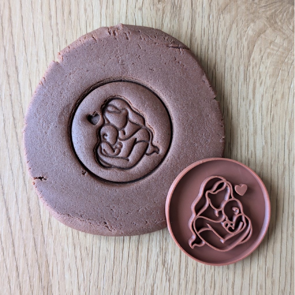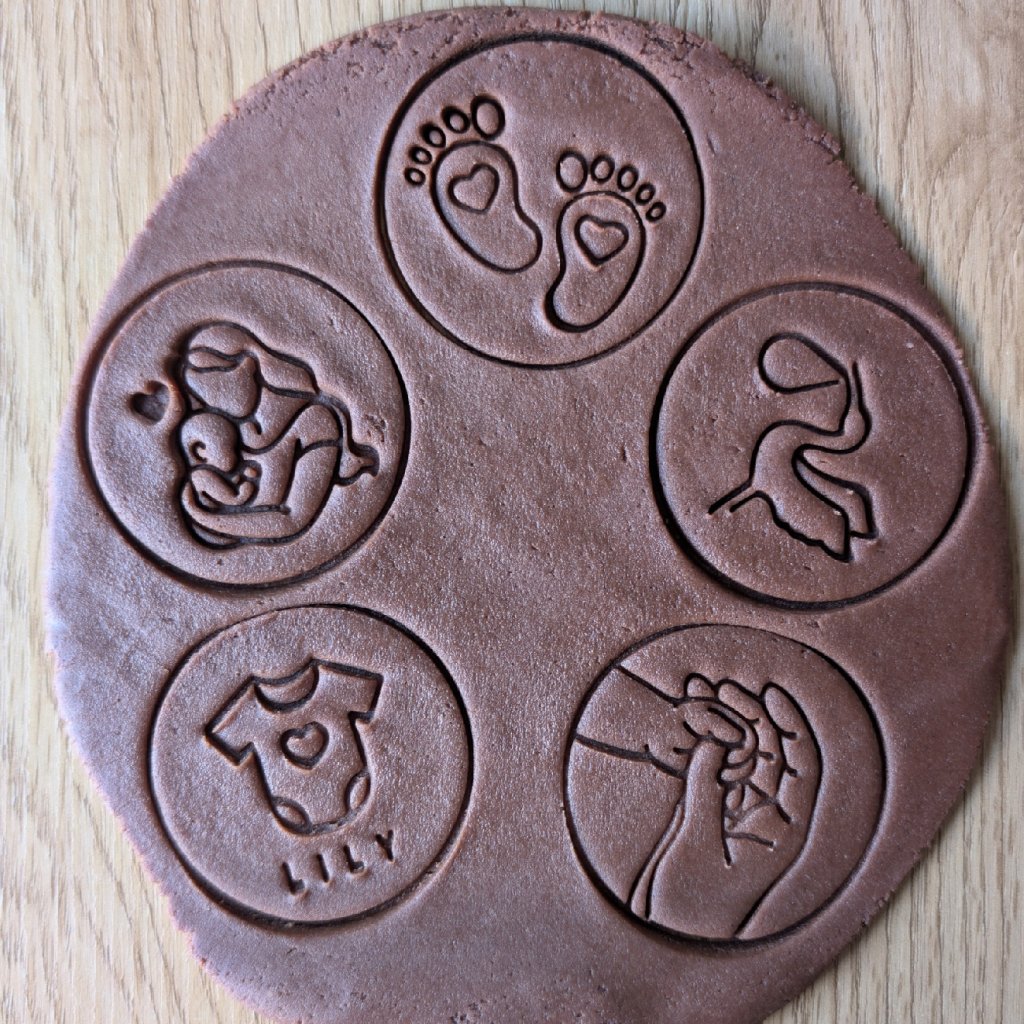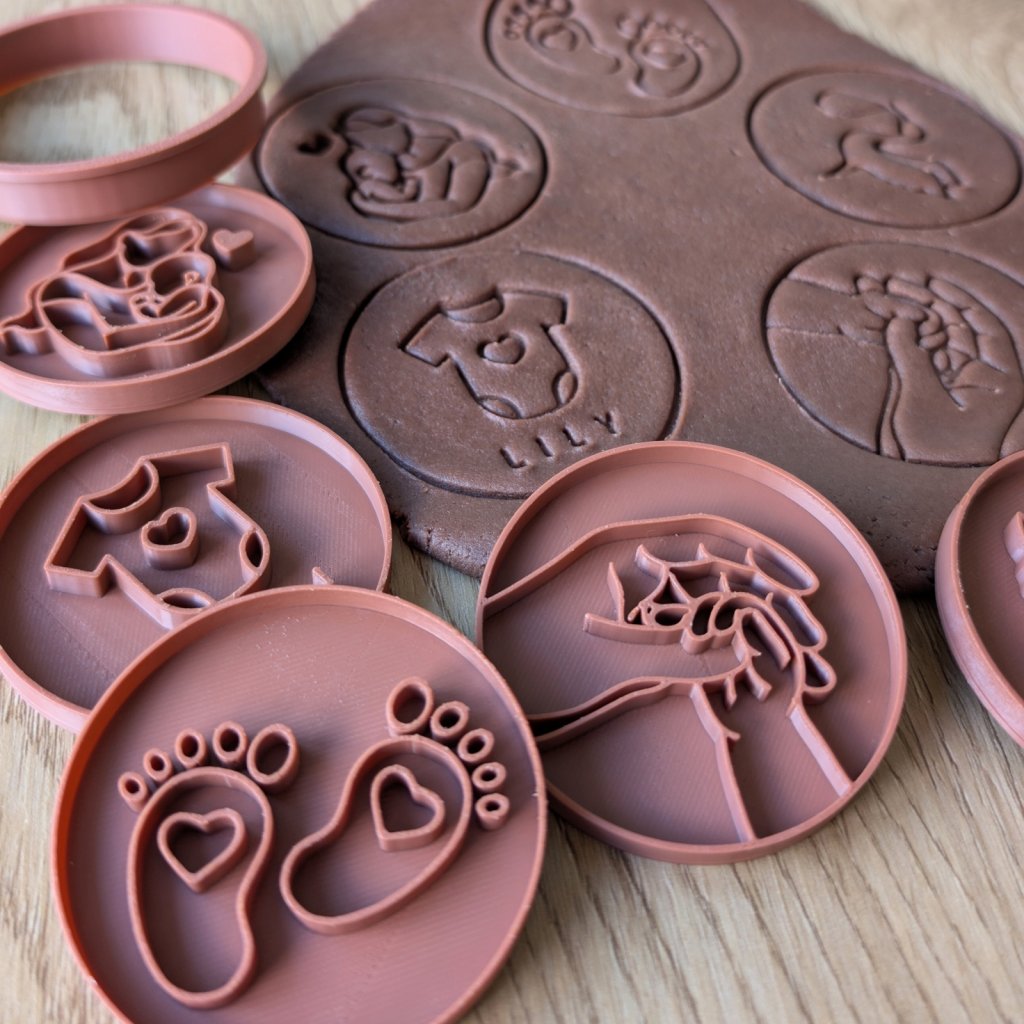 Sada obsahuje jedno kulaté obrysové vykrajovátko a pět kruhových razítek. Čtyři razítka mají krásné dětské motivy (např. ručička, stopa, kočárek, máma s miminkem). Páté razítko je personalizované s vlastním jménem na přání, které dodá vašim sušenkám nezaměnitelnou hodnotu.