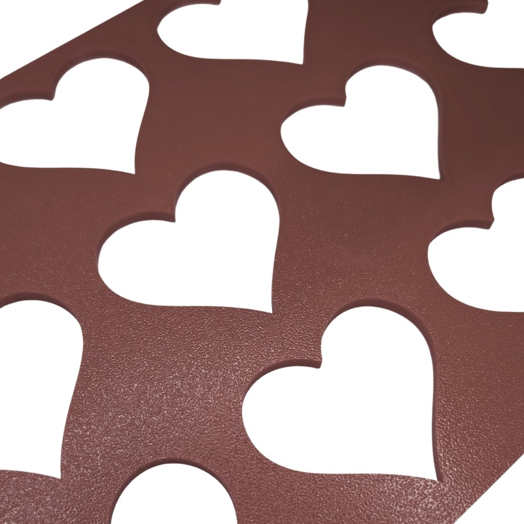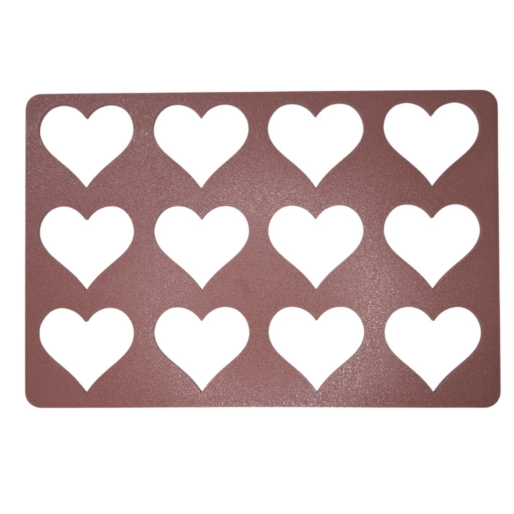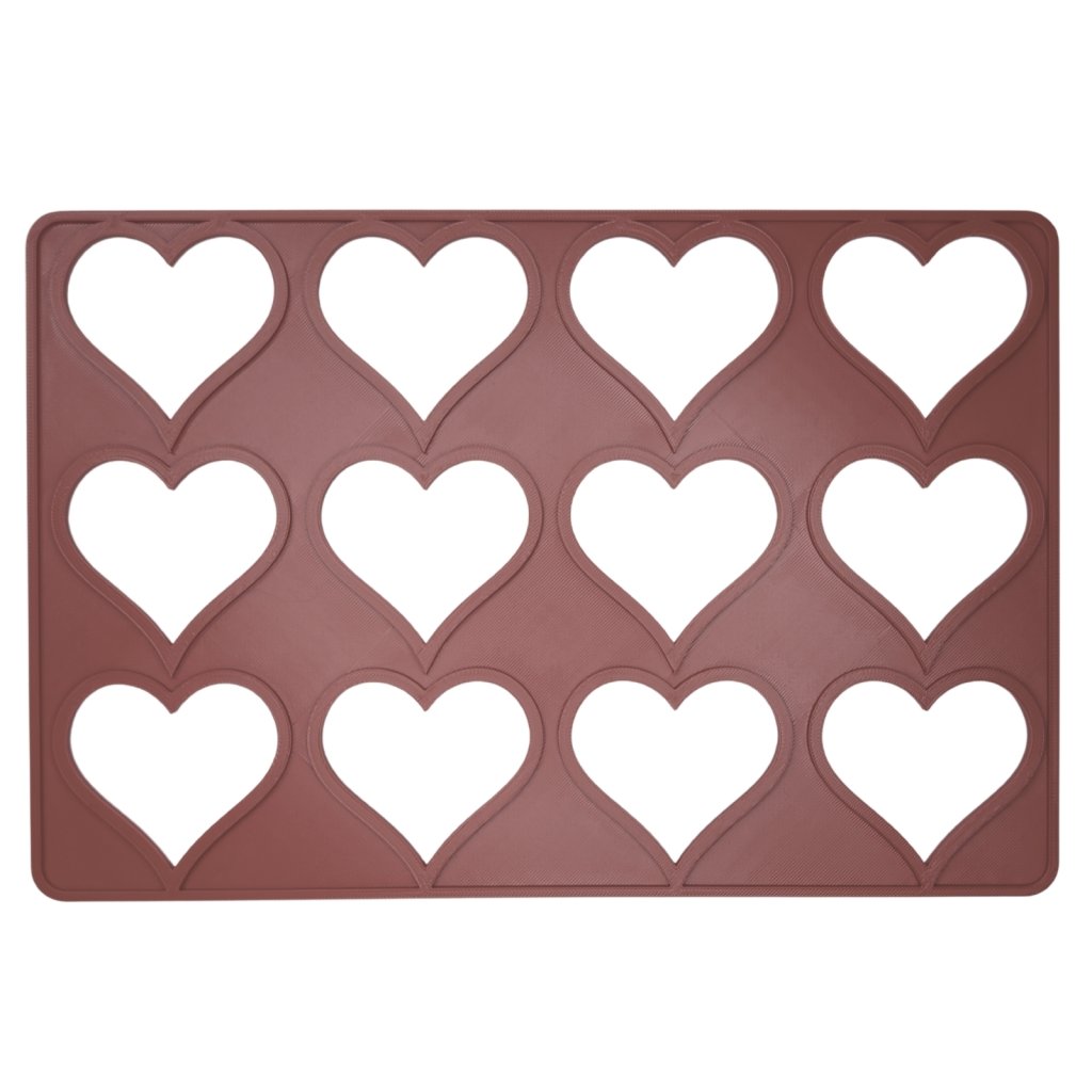 Šablona má praktický rozměr 20 x 30 cm, což odpovídá přesně polovině standardního pečicího plechu, a je tak ideální pro pečení v domácí troubě. Obsahuje 12 identickýh otvorů ve tvaru srdce (uspořádaných do 3 řad po 4 kusech), což optimalizuje kapacitu a pečení v dávkách.