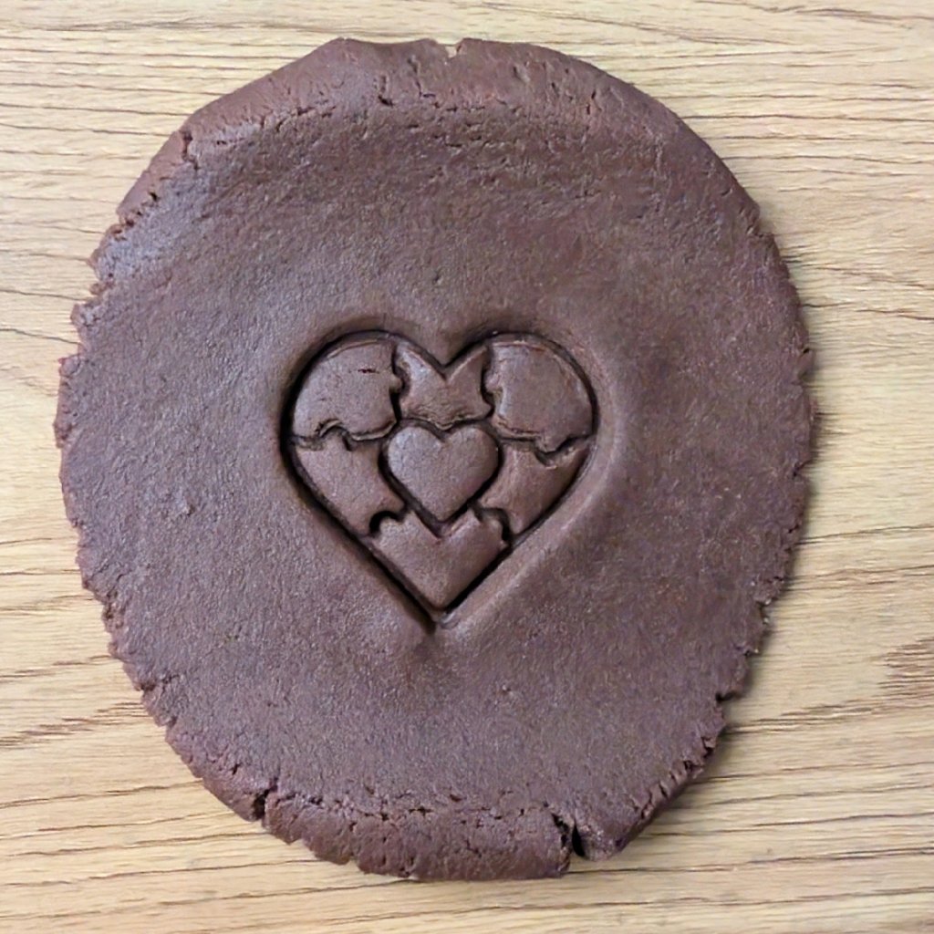 Postup je jednoduchý a zábavný: nejprve vykrojíte základní tvar srdce pro spodní i horní díl sušenky. Poté vezmete razítko s motivem puzzle dílků a vtisknete vzor do horního dílu. Pro výrazný efekt doporučujeme razítko před použitím namočit do kakaa – linie puzzle tak zůstanou tmavé a krásně vyniknou. Nakonec vykrojíte středový otvor, aby po slepení mohla prosvítat barevná marmeláda.