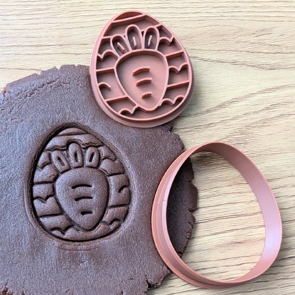 Tohle vykrajovátko s motivem mrkvičky schované ve vajíčku je krásným a hravým kouskem pro jarní pečení, který zaručeně potěší malé i velké koledníky. Skládá se ze dvou částí – obrysové formičky, kterou z těsta čistě vykrojíte klasickou siluetu hladkého vajíčka, a samostatného razítka pro vytlačení detailu samotné mrkve a vlnkovaného vzoru v pozadí.